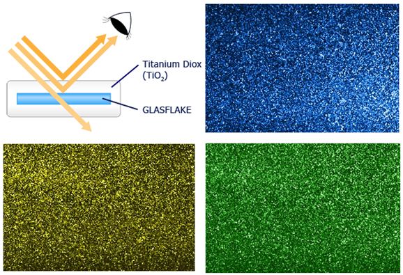 MetaShine is a highly glittering pigment with excellent surface smoothness, produced with metal or metal oxide coating on GLASFLAKE . Coatings with METASHINE added to paint or resins produce clear and elegant color tones and a unique metallic luster. It is widely used in a variety of applications in producing motorbikes, electric appliances, cellular phones, inks, and cosmetics.